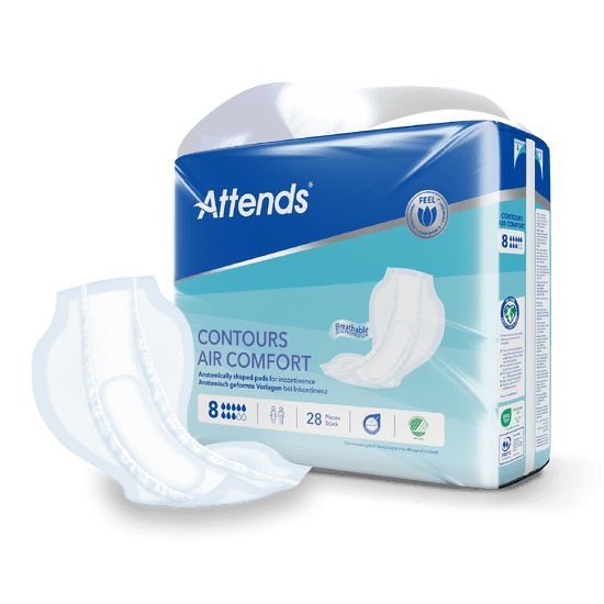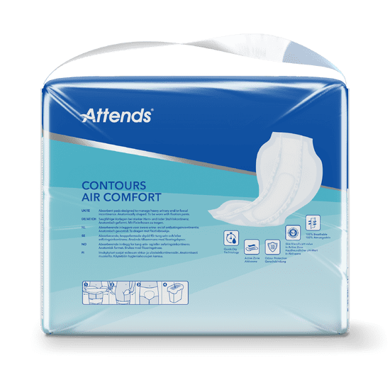 Attends Contours Air Comfort 8 are anatomically shaped pads, featuring a breathable backsheet, designed to manage heavy urinary and/or faecal incontinence. This pad is designed to fit close to the body for extra comfort and leakage protection. To be used with a fixation pant.