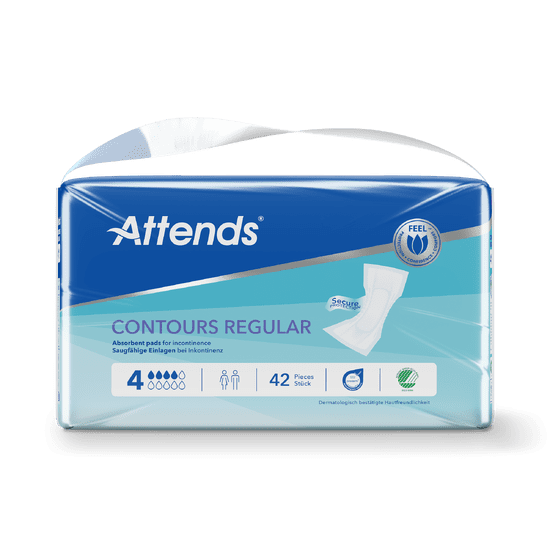 Attends Contours Regular 4 is a shaped pad designed to manage moderate incontinence. Fixation tape allows the pad to be worn with close fitting underwear for extra discretion.