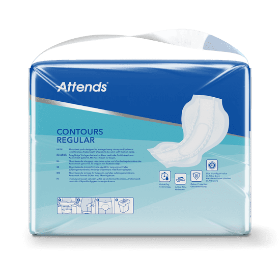Attends Contours Regular 6 is a body shaped pad designed to manage heavy urinary and/or faecal incontinence. Featuring a wetness indicator, this pad is designed to help you identify when the pad should be changed, helping individuals and carers get the most from each pad.