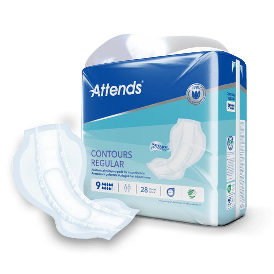Attends Contours Regular 9 are body shaped pads designed to manage heavy bladder or bowel incontinence (urinary or faecal incontinence). This pad is designed to fit close to the body for extra comfort and leakage protection even when experiencing multiple gushes. Wetness indicator on the back sheet helps individuals and carers get the most from each pad.