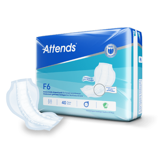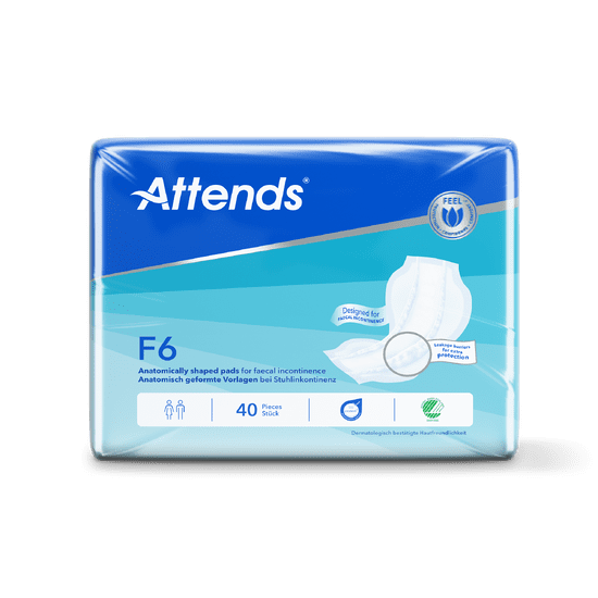 Attends F6 is a simple and economical body shaped pad, designed for bowel (faecal) incontinence only. This pad is designed for individuals who experience only bowel incontinence. Attends F6 must be changed immediately once soiled for good hygiene.
