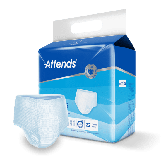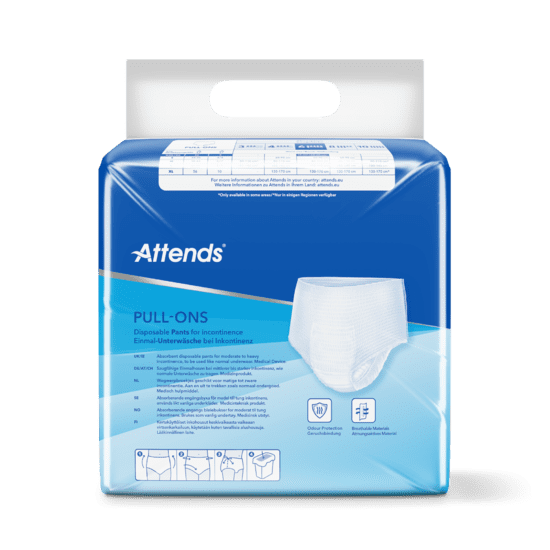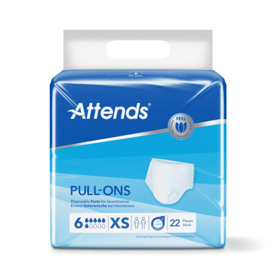 Attends Pull-Ons 6 XS are soft and discreet pants that feel like underwear. The disposable pants can easily be pulled up and down and they are designed to manage moderate to heavy incontinence. Attends Pull-Ons provide a superior fit for extra comfort. The highly absorbent core protects against leakage and odour, for an active life with the feeling of security.