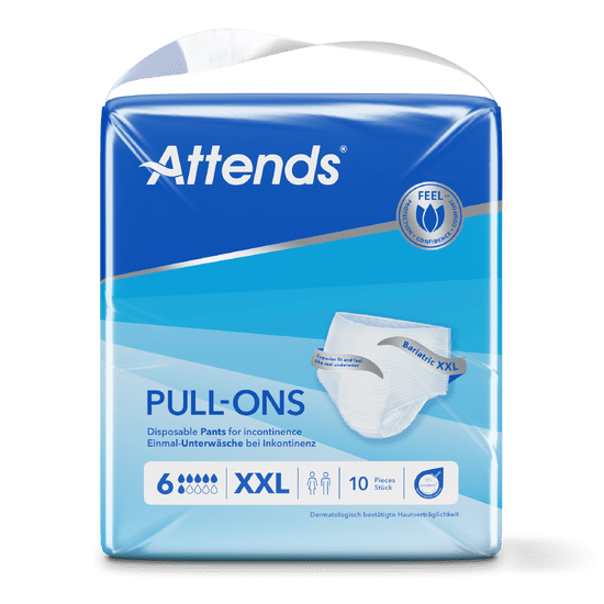 Attends Pull-Ons 6 XXL are soft and discreet pants that feel like underwear. The disposable pants can easily be pulled up and down and they are designed to manage moderate to heavy incontinence. Attends Pull-Ons provide a superior fit for extra comfort. The highly absorbent core protects against leakage and odour, for an active life with the feeling of security.
