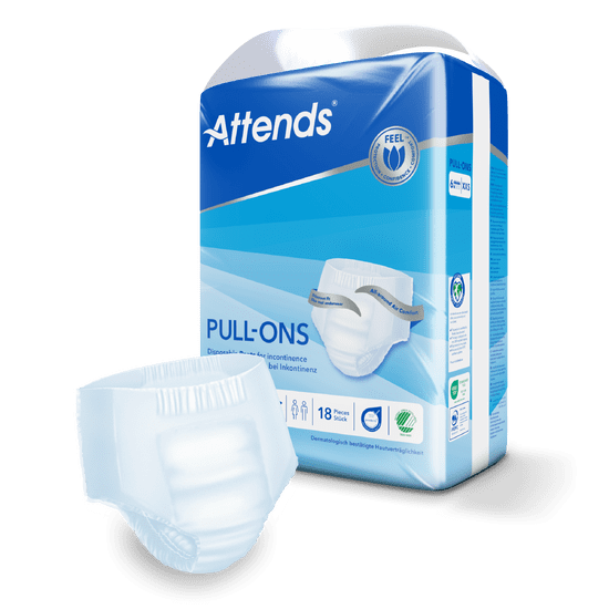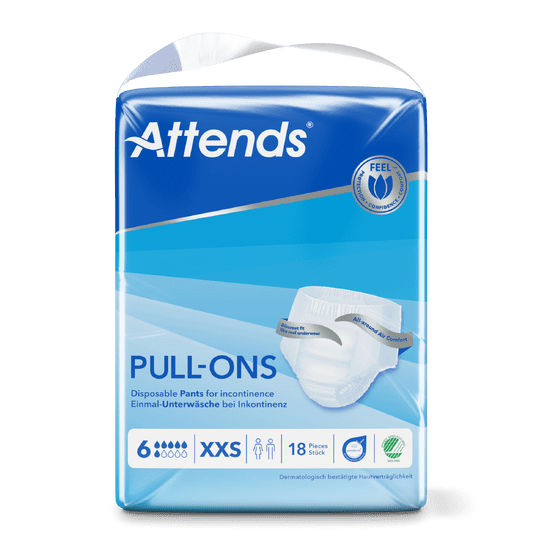 Attends Pull-Ons 6 XXS are soft, discreet pants that feel just like regular underwear. These disposable pants are designed to manage moderate to heavy incontinence and can be easily pulled up and down. Attends Pull-Ons 6 XXS have a lower waist rise for added discretion, and the elastic, textile-like side panels provide a snug and comfortable fit. The highly absorbent core offers reliable protection against leaks and odours, helping you stay active with confidence.
