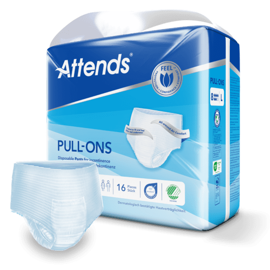 Attends Pull-On 8 L are absorbent disposable pants designed to manage heavy bladder and/or bowel incontinence (urinary/faecal). These pants look like regular underwear to help you feel confident throughout the day and can be worn without any other underwear required. The pants have a flexible shape which fit close to the body and an absorbent core to help reduce the risk of leakage.