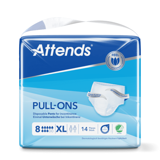 Attends Pull-On 8 XL are absorbent disposable pants designed to manage heavy bladder and/or bowel incontinence (urinary/faecal). These pants look like regular underwear to help you feel confident throughout the day and can be worn without any other underwear required. The pants have a flexible shape which fit close to the body and an absorbent core to help reduce the risk of leakage.