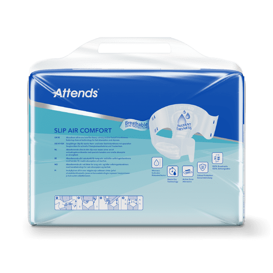 Attends Slip Air Comfort 10 Medium is an absorbent all-in-one brief, featuring channel technology for fast absorption and instant dryness. They are designed to manage heavy urinary and/or faecal incontinence. The resealable fixation system helps to secure the product in place and reduce the risk of leakage.
