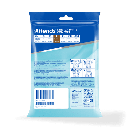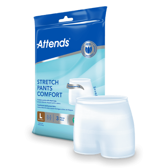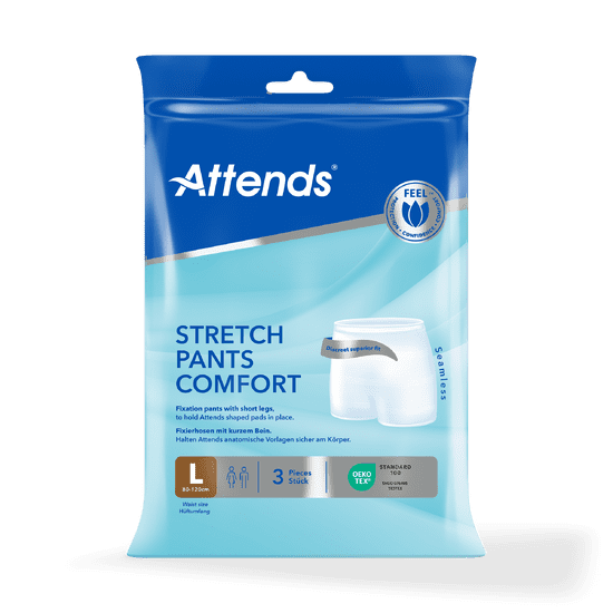 Attends Stretch Pants Comfort L – are reusable and washable fixation pants with short legs. They provide a close and comfortable fit to securely hold Attends shaped pads in place, for reliable leakage protection. These pants are made of a soft elastic and breathable material, ensuring a superior fit and feel. The seamless design offers a discreet and secure fixation and prevents any marking of the skin. Available in size S – XXXL. For optimal performance, be sure to choose the correct size of fixation pants by measuring the hips and waist and choosing the larger of these two sizes