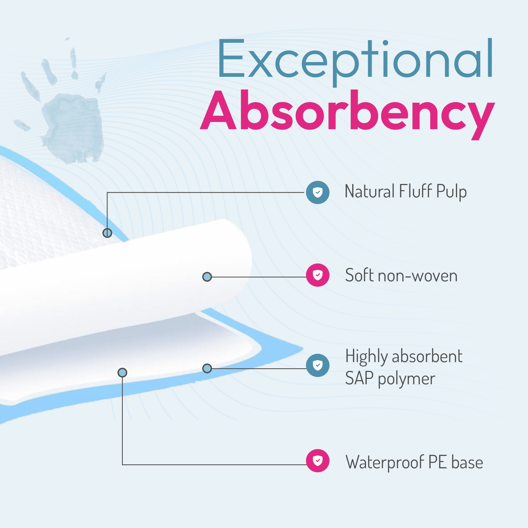 💧 Maximum Dryness: Powered by 5g of Super Absorbent Polymer (SAP) per pad — each gram absorbs up to 150ml, turning liquid into gel for lasting dryness and odour control.